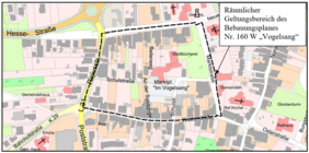 Der Geltungsbereich des Bebauungsplanes Nr. 160 W „Vogelsang“ gemäß § 13a BauGB mit örtlichen Bauvorschriften wird im Osten durch die Markstraße, im Norden durch die Neue Straße, im Westen durch die Risiusstraße und im Süden durch die Westerstraße begrenzt. Das Plangebiet ist ca. 48.800 m² groß.