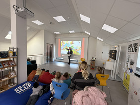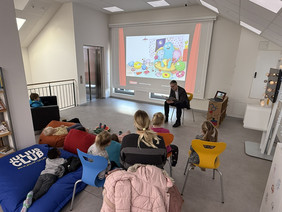 Neun gebannte Kinderaugen und gespitzte Ohrenpaare hörten am Freitagmorgen die Geschichte von den Mummels, die einen „Total genialen Mummeltag“. Der Grund ist der Bundesweite Vorlesetag, in dem in ganz Deutschland Kindern vorgelesen wird. In Weener stand heute ein Abstecher einer Kleingruppe des Kindergartens Bunte Welt in die neue Stadtbücherei auf dem Programm. Dort hatte Büchereileiterin Sarah Möhlmann nicht nur eine kuschelige Sitzecke für die Jungen und Mädchen vorbereitet, sondern auch das begleitende Bilderkino per Beamer an die Wand gestrahlt. So konnten die Kinder die Bilderbuchgeschichte in Übergröße an der Leinwand betrachten.