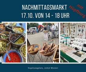 Durch den Feiertag zur Deutschen Einheit mussten Marktfreunde auf einen Nachmittagsmarkt am 3. Oktober verzichten. Nun am Donnerstag, 17. Oktober, ist der Nachmittagsmarkt auf dem Vogelsanplatz von 14 bis 18 Uhr in Weener allerdings wieder zurück. Mit Hüpfburg und Einkaufstaschen bemalen für die Kinder, kulinarischen Angeboten und frischen Waren für die Großen ist wieder einiges geboten. Am Donnerstag werden folgende Stände mit dabei sein: De Zeeg (Ziegenkäse), Kalamatthi (mediterrane Köstlichkeiten), de Hund Schüür (Hundesnacks), Würstel Matthi (Thüringer Bratwurst), Reinhard Lodde (Fleisch und Eier), Felix Ike (afrikanische Spezialitäten), Christa Schütte (Deko), Heuperle (Deko), NaturPro (Cremes und Seifen), Vorwerk (Staubsauger) und Grijze (Kaffee und Kuchen).