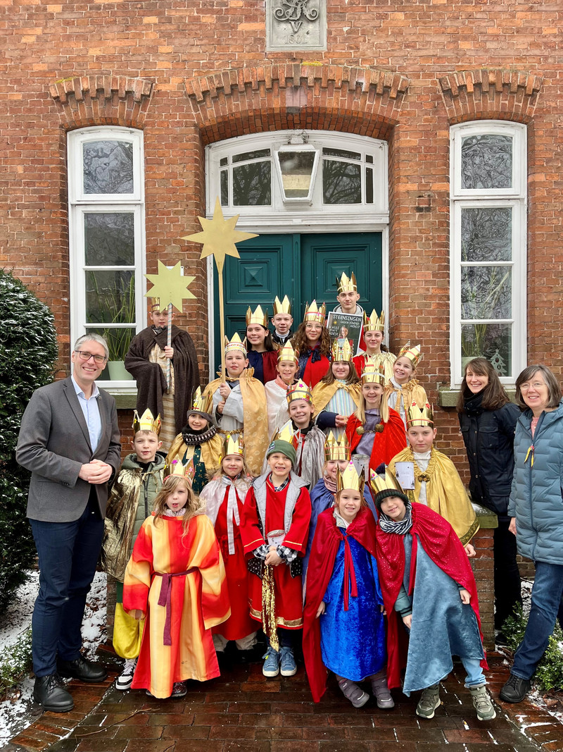 Zu Beginn des Besuchs im Rathaus wurde gemeinsam musiziert. Die Kinder sangen Lieder und wurden dabei an der Gitarre begleitet. Im Anschluss schrieben sie den traditionellen Segensspruch an die Mauer des Rathauses beim alten Eingang zur Norderstraße. Im Rathaussaal durften sich die Kinder dann stärken. Dabei erzählten sie auch vom diesjährigen Motto des Dreikönigssingens: „Schule statt Fabrik – Sternsingen gegen Kinderarbeit“. In der Aktion wird der Blick nach Bangladesch gerichtet. Sternsinger-Partnerorganisationen setzen sich dafür ein, Kinder aus Arbeitsverhältnissen zu befreien und ihnen den Schulbesuch zu ermöglichen.