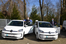 In beiden Fällen handelt es sich um vollelektrische VWUps. Andre Tammen (links), Geschäftsführer des Autohauses Züchner in Weener, übergab Papiere und Schlüssel an Bürgermeister Ludwig Sonnenberg (rechts).