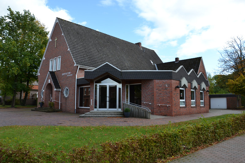 Zur Grundsteinlegung der neuen Kapelle, die die seit 1896 selbstständige Baptistengemeinde nach langen Verzögerungen bauen konnte, heißt es in der Tageszeitung: "Von nun an ergriff ein wahres Feuer der Begeisterung die ganze Gemeinde. In der Baugrube stand der Prediger neben dem Arbeiter, der Handwerker neben dem Kaufmann."Im Juli 1956 konnte die Kapelle eingeweiht werden, 156 Mitglieder hatte die Gemeinde damals. Als 1981 / 82 die Zahl der Gläubigen über 200 angestiegen war, wurde die Kapelle in zwei Bauabschnitten erweitert und vergrößert. So entstand das schmucke Gemeindezentrum der Baptisten mit dem Kirchenraum im Mittelpunkt, der durch seine warme Holzvertäfelung sehr einladend wirkt. An der Stirnseite des Gottesdienstraumes befindet sich das Taufbecken, in das die Täuflinge hinein steigen, um die Taufe zu empfangen. In den Gruppen- und Nebenräumen des Gemeindezentrums einschließlich der benachbarten Teestube findet das reichhaltige Leben der Gemeinde statt.
