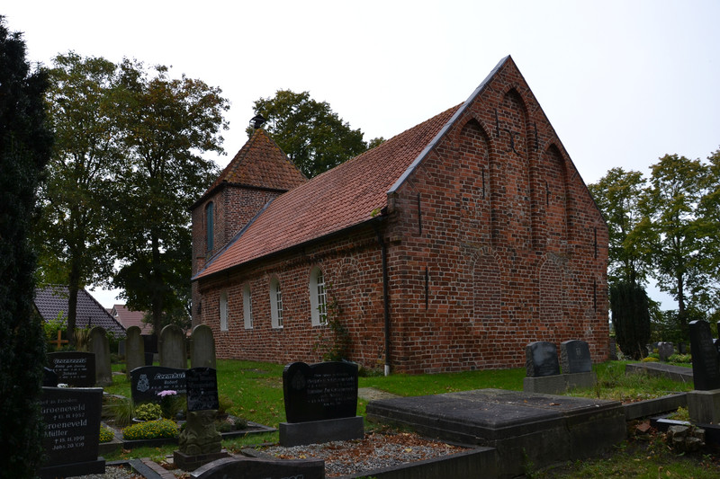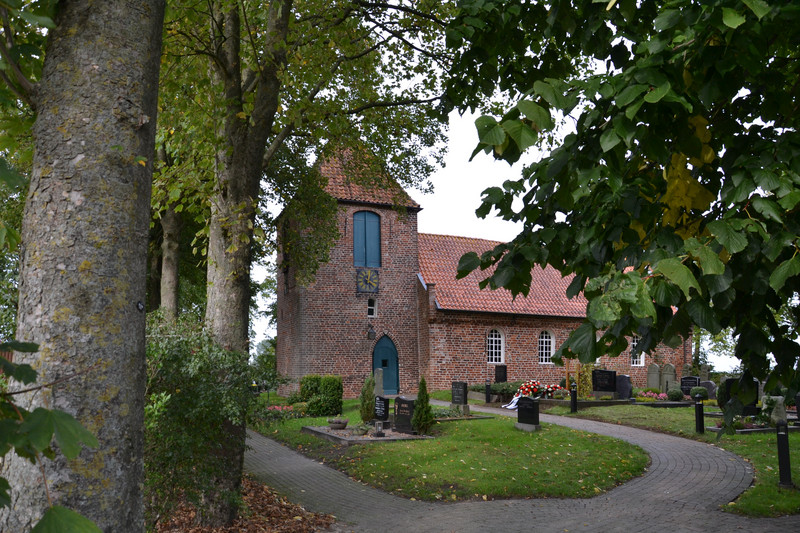 Versteckt hinter den Häusern des lang gestreckten Dorfes liegt auf einer Warf die im 14. Jh. erbaute Kirche. Außen und innen kann man an ihren Mauern die bewegte Geschichte kennenlernen, die der kleine Bau hinter sich hat. Die Fenster an der Südseite sind neu. Unter dem westlichen erkennt man die zugemauerte romanisch - rundbogige Tür, die wegen des im Laufe der Jahrhunderte angewachsenen Friedhofes sehr niedrig ist. Auch im Ostteil ist noch ein zugemauertes Fenster zu sehen. Die neuen Fenster berühren den gut erhaltenen Zahnschnittfries, der sich unter der Dachtraufe entlang zieht.